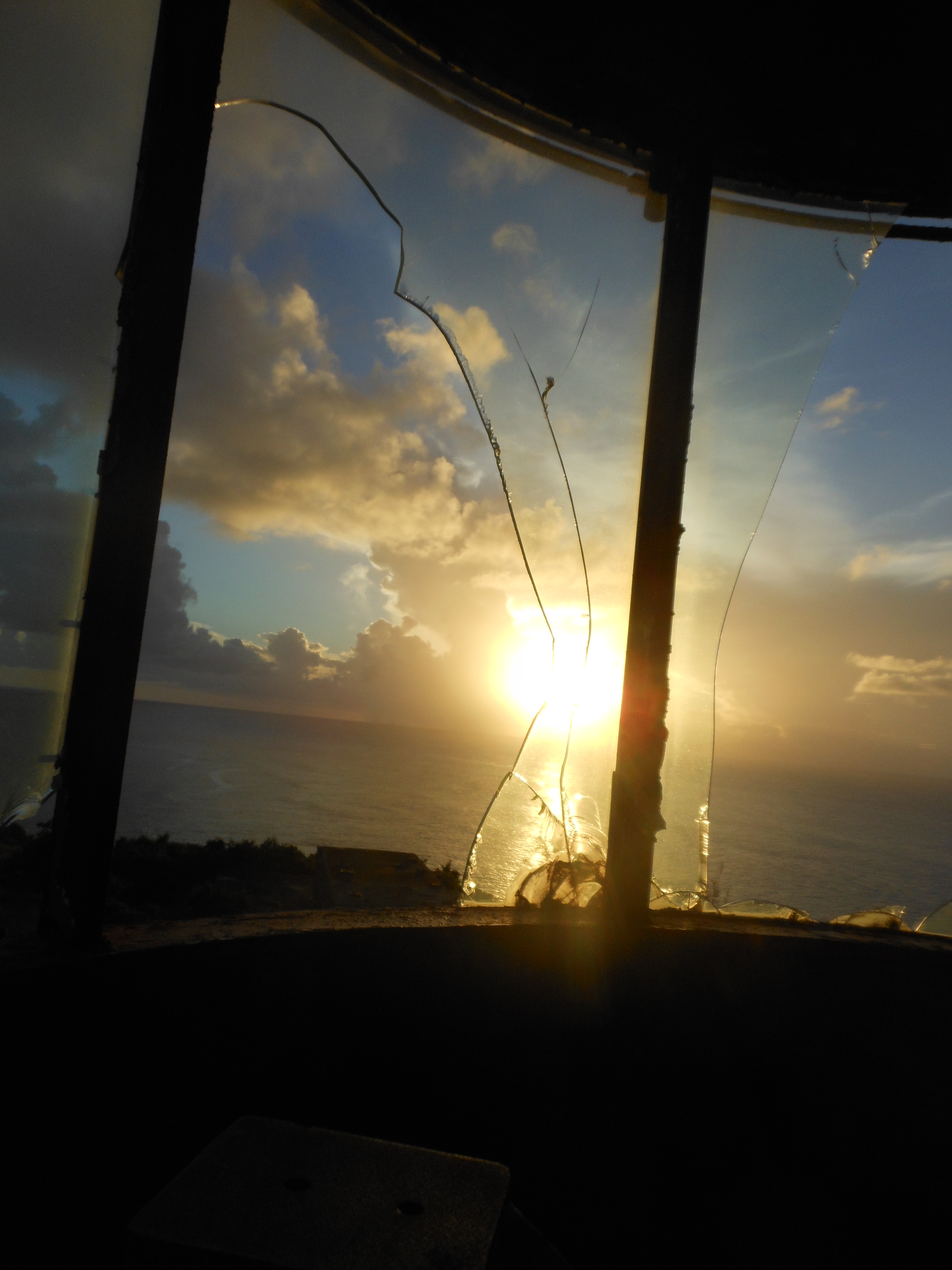 The lens was long gone. Most of the lantern room glass too. We found the broken bits on the ground at the base of the lighthouse. Some huge chunks of Fresnel lens mixed in with so much window glass. (YBW brought some home and keeps them on his desk at work and here at home.)