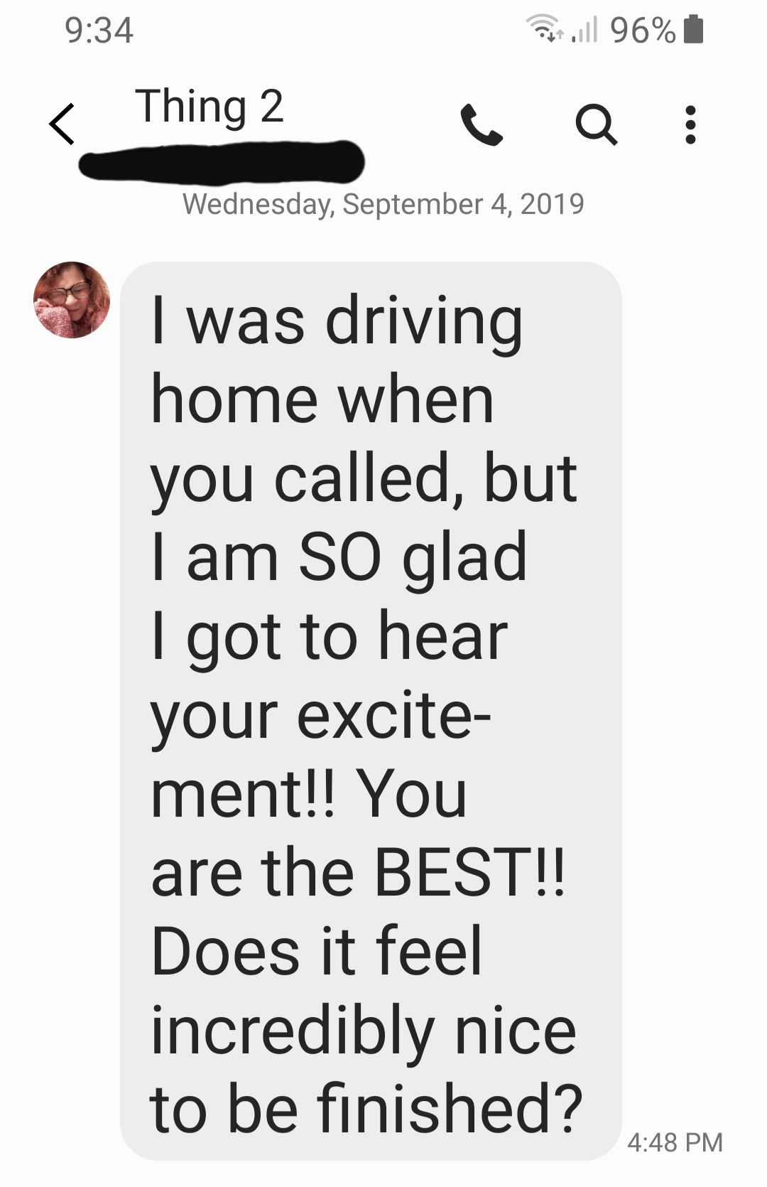 Thing 2 replied, “How are you feeling about that email?” then after a bit I got a text that said, “How are you feeling about that email? Or are you not ready to discuss it yet?”