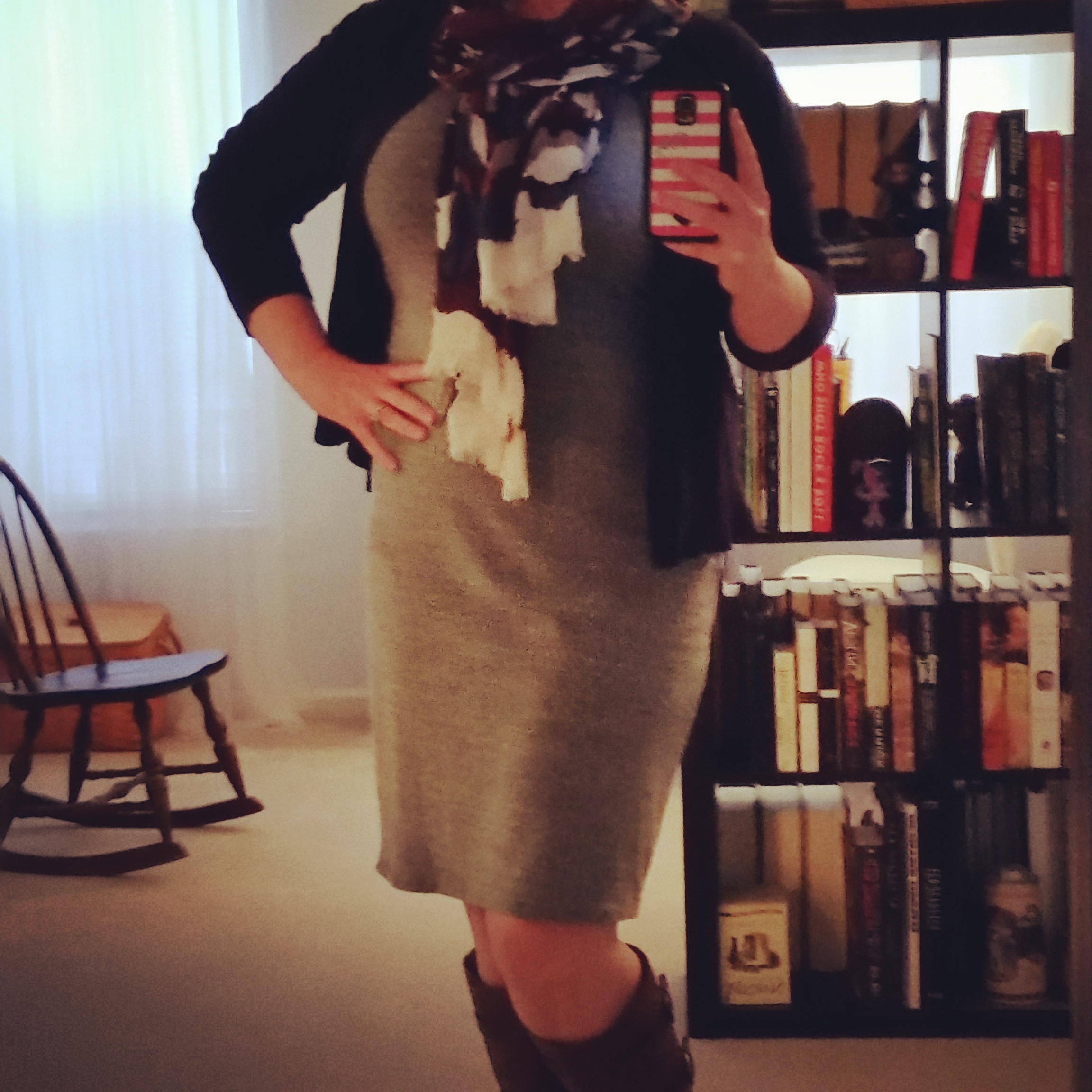 Heather gray with a navy cardigan (cardigans are my #1 go-to article of clothing), a cream, navy, gray, mustard and burgandy scarf and (gorgeous) brown boots.