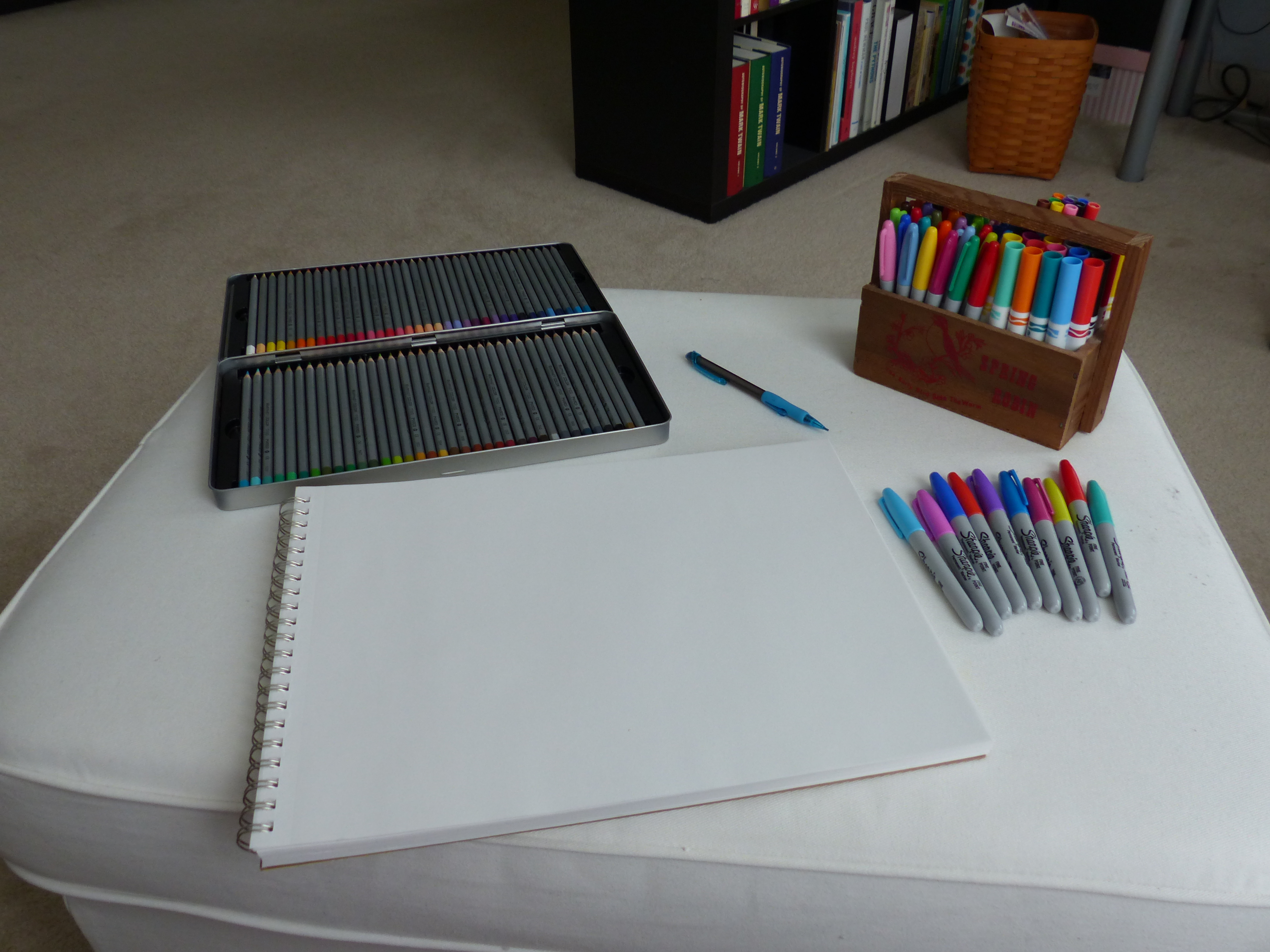Now I’m armed with list in hand to keep my thoughts organized. My perfect collection of colored pencils and myriad Sharpie and Crayola markers wait at the ready.