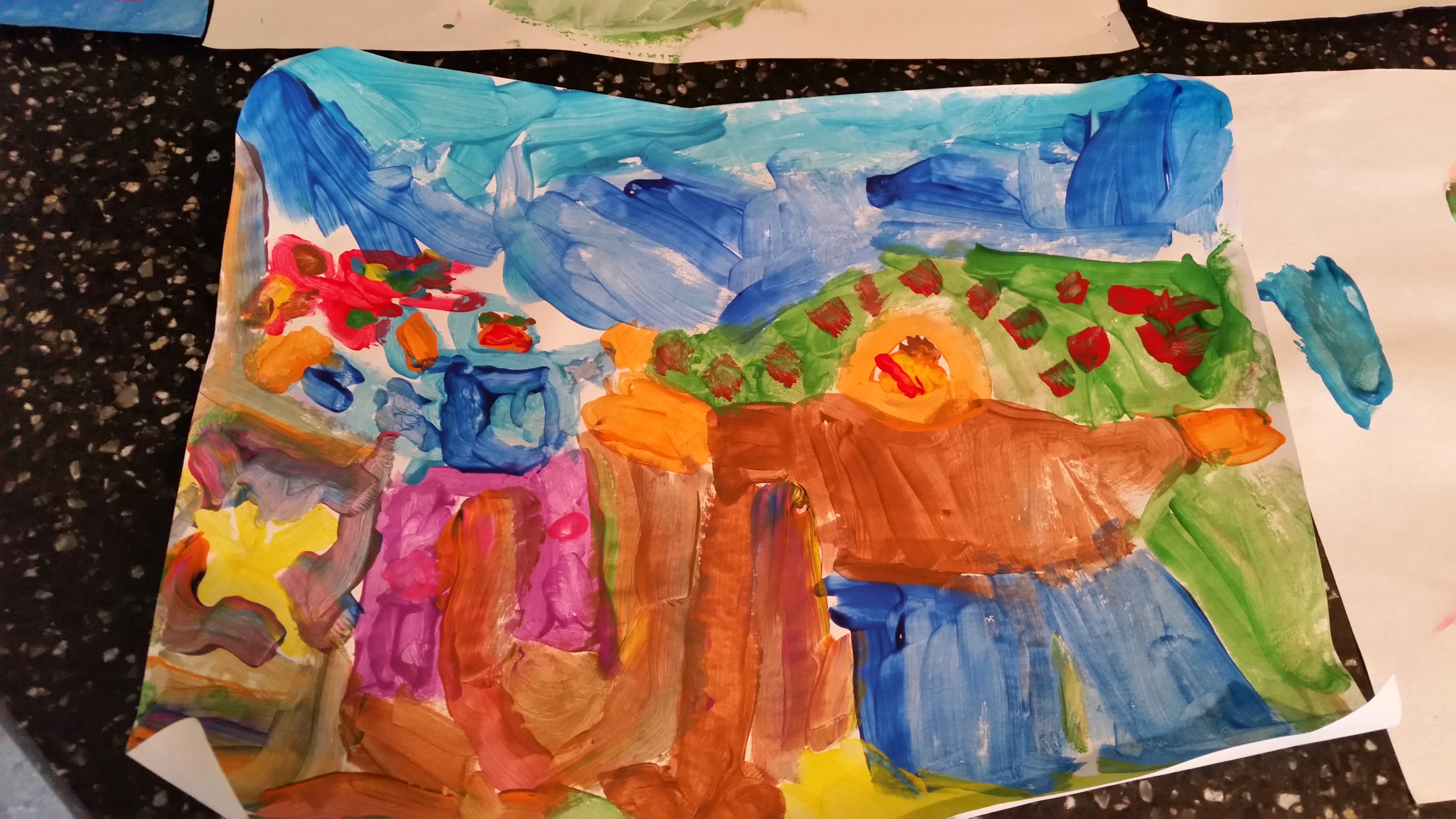 I see brightness of color in great big splotches. (Not quite polka dots, but close.) It’s more tactile, I can see how I painted with my fingers. It is filled with joy and wild abandon, and more love than has ever been present on my canvas of life. This portion of the painting is enormous.
