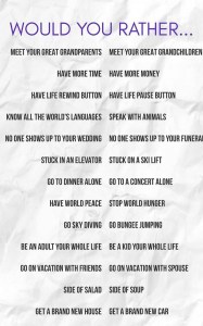 One of my first examples was: Thing 2 could come visit and it would feel so long and we’d feel like we had enough quality time, but no time would have passed while she was here, so she wouldn’t have to take time off from work, etc.