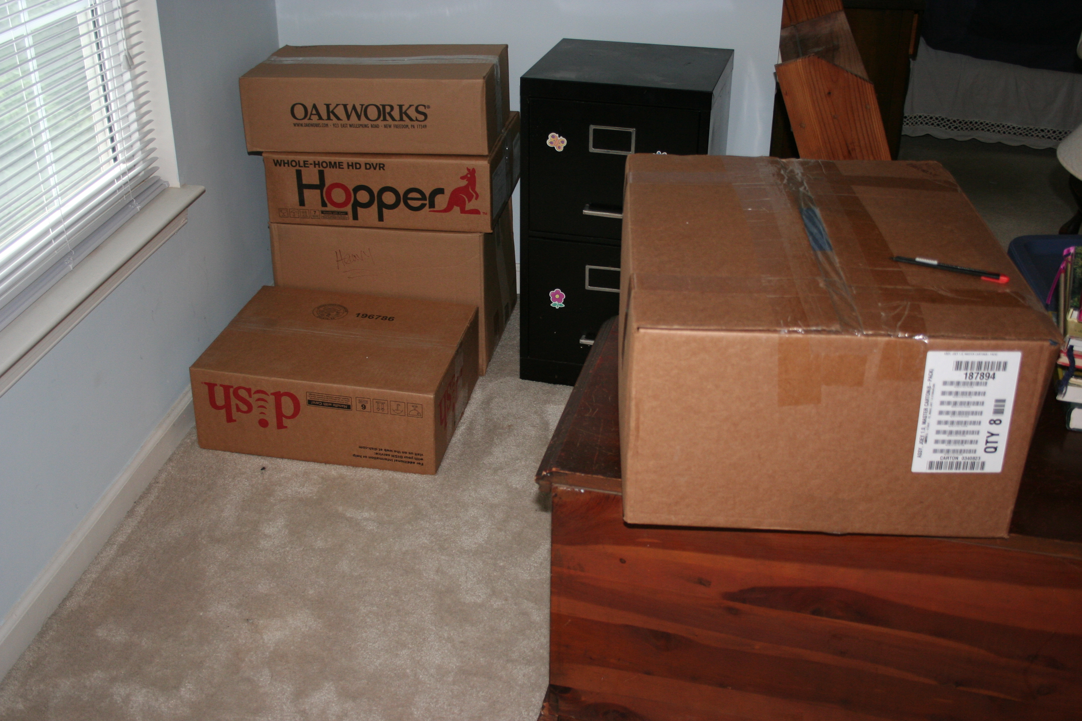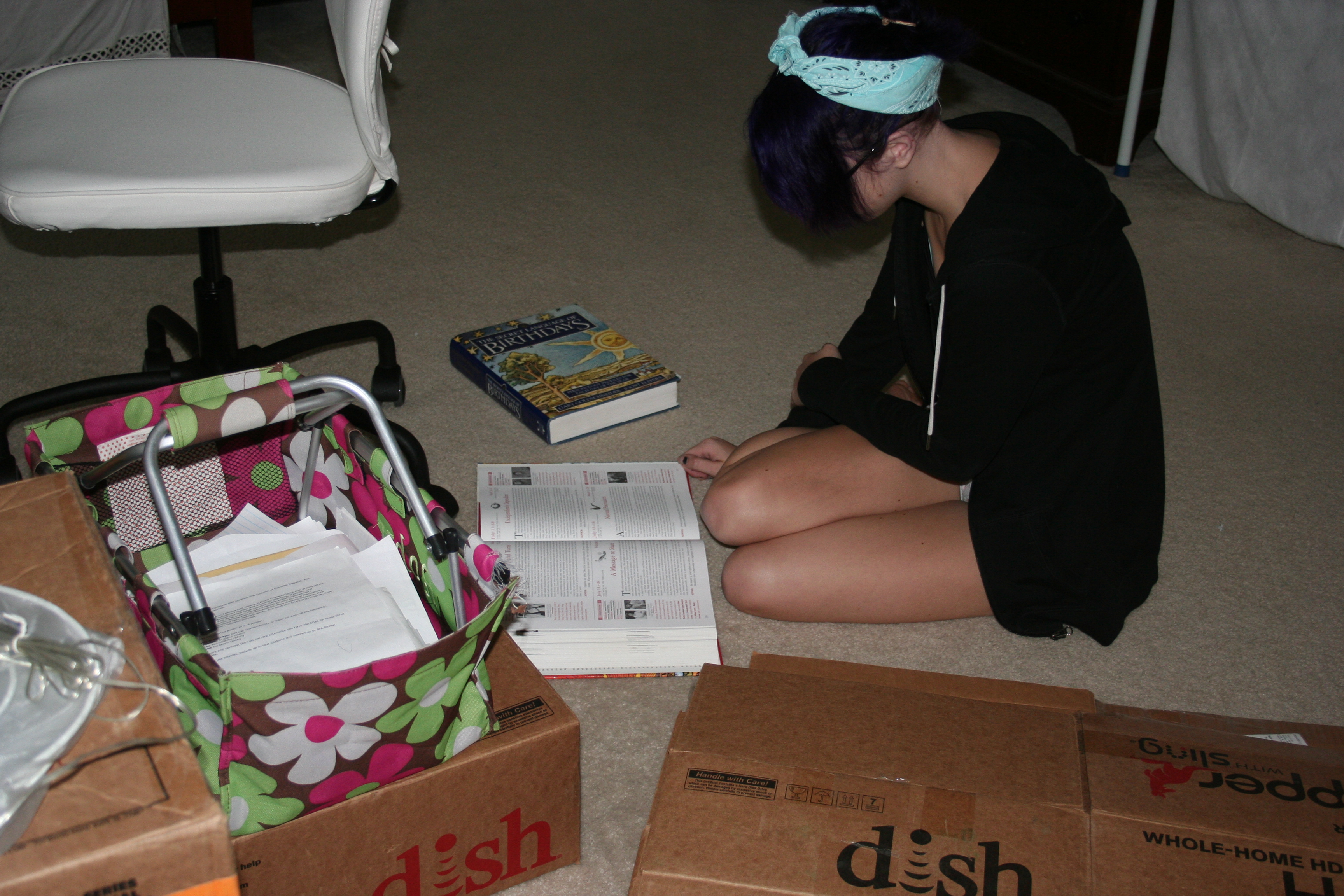 I finally began to open boxes of books and began to breathe. What is it that makes me feel so strongly about those books? I have no idea, but I can tell you how happy I was to unpack, stack and shelve them! Thing 2, with her uncanny timing, wandered in just in time to read about her boyfriend’s birthday in the Birthday book and their compatibility in the Relationship book.
